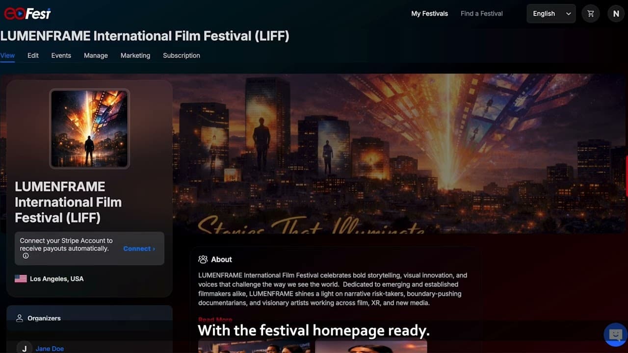 Built In, Not Bolted On: This isn’t an afterthought - it’s part of the platform.Upload Once, Benefit Forever: Posters, trailers, and film materials uploaded to your festival page stay accessible year-round.Global Filmmaker Community: Festivals become hubs where filmmakers connect, share, and self-distribute, creating lasting value beyond the event itself.
